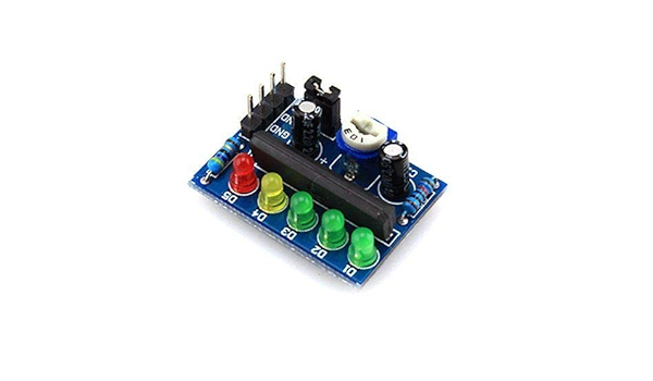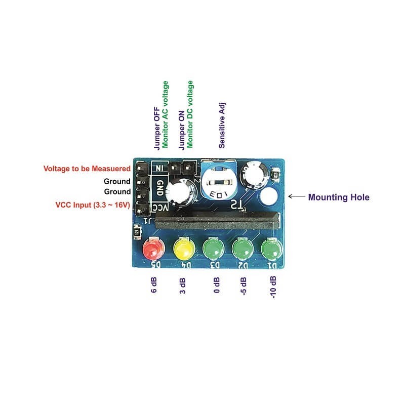 The module uses the KA2284 LED Dot Level Meter Driver IC to implement a logarithmic LED dot indicator display. The display consists of 5 LEDs – 3 green, 1 yellow and 1 red which are lit in sequence as the input voltage increases.